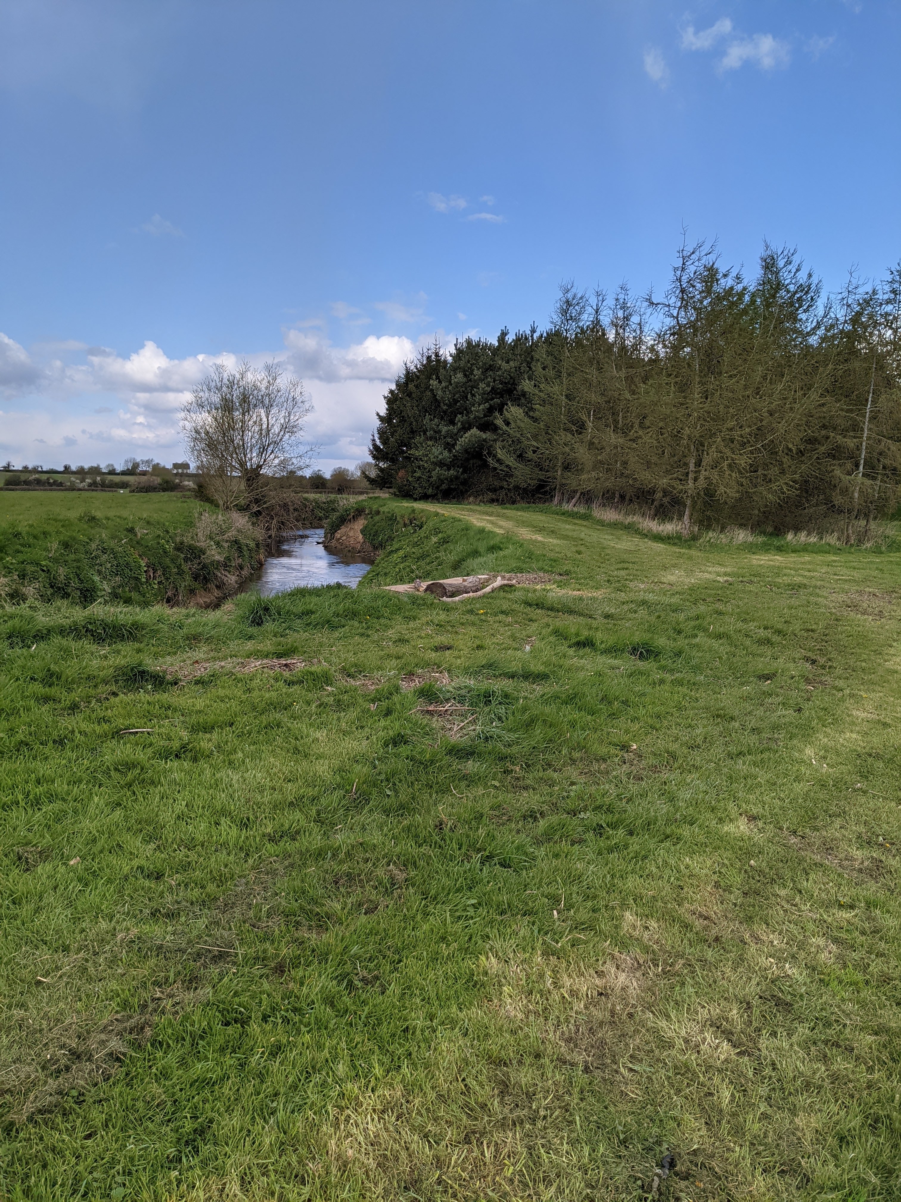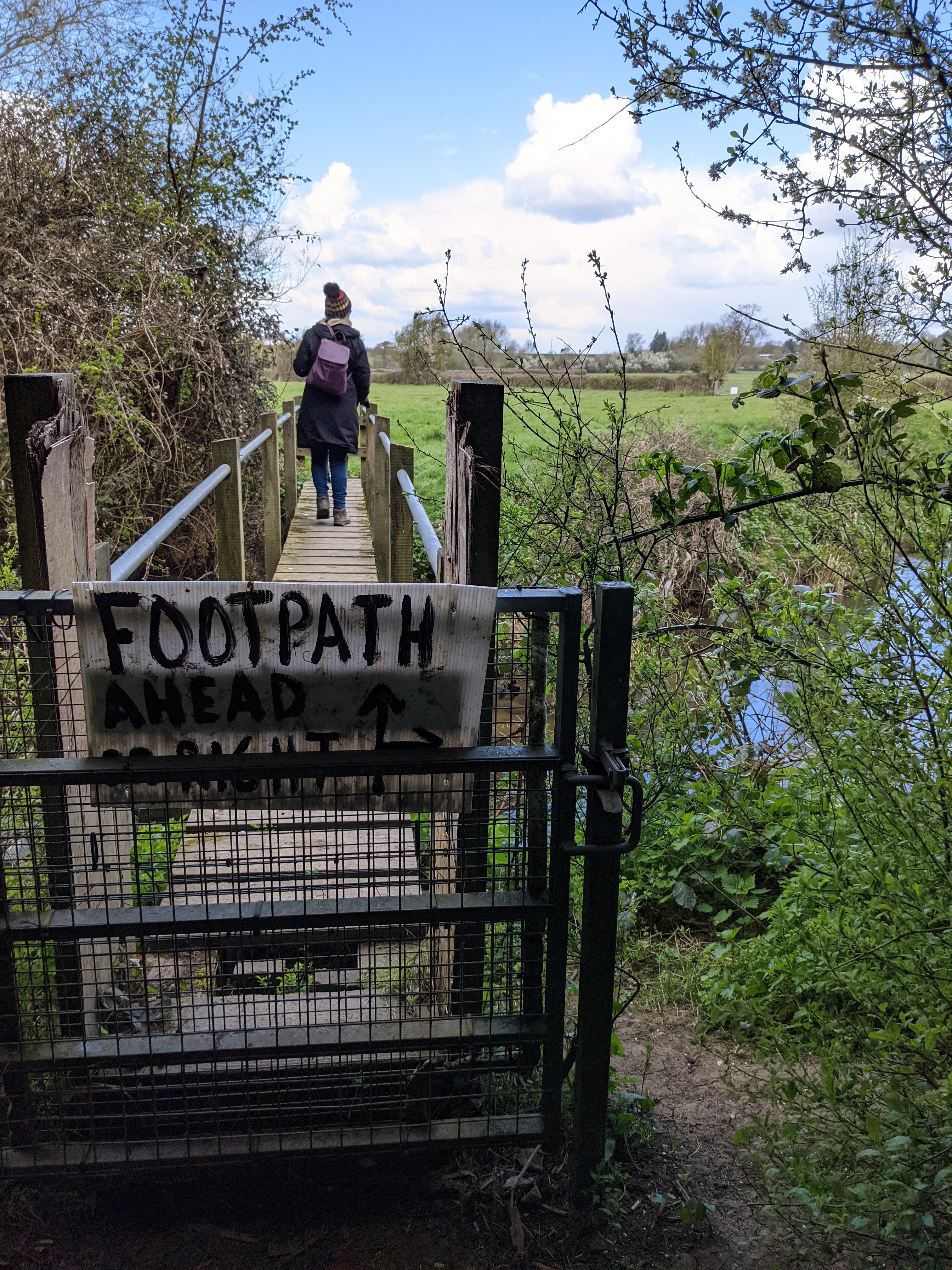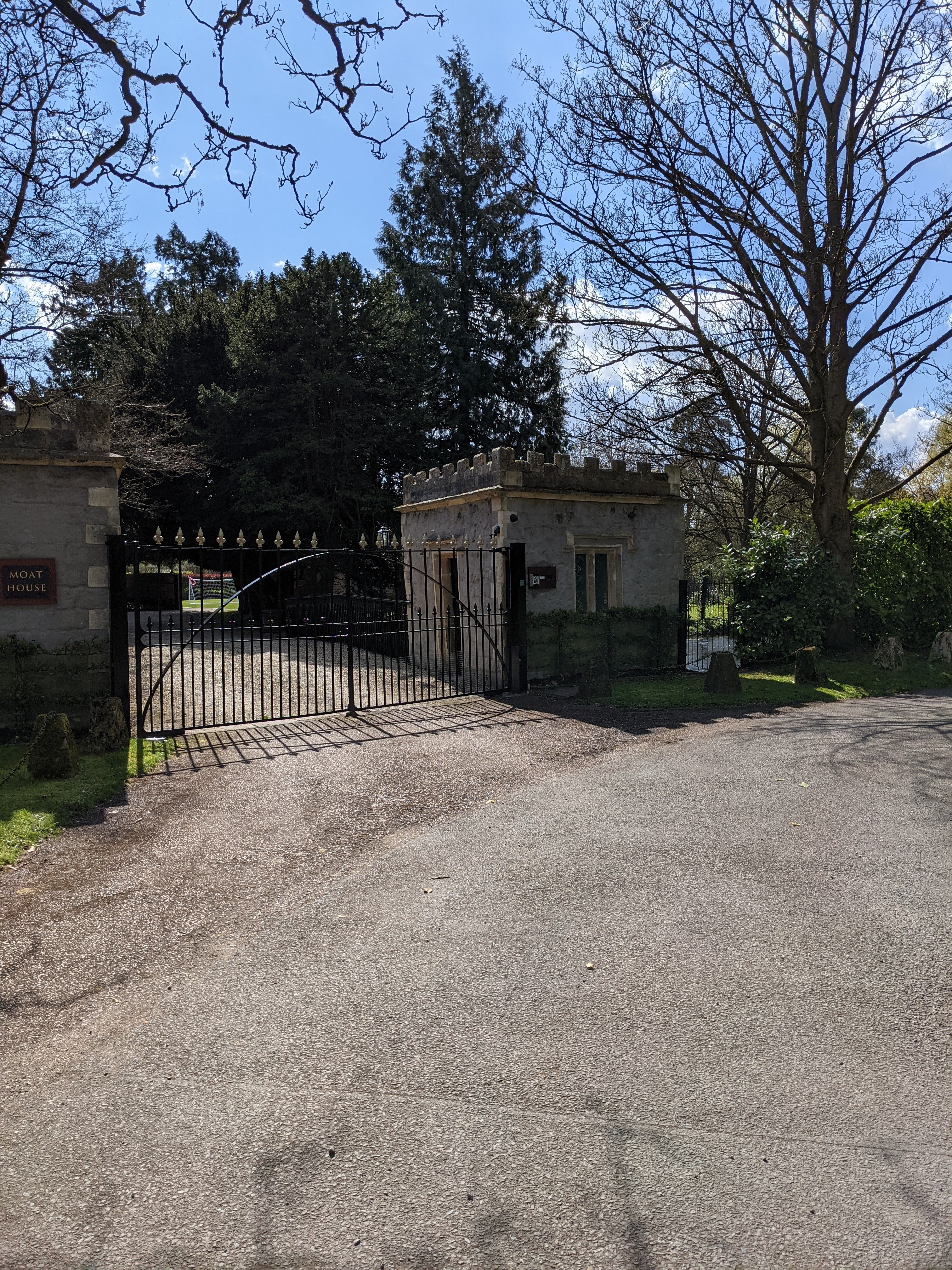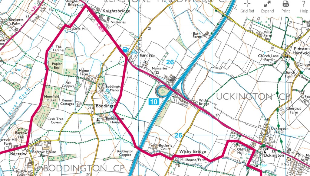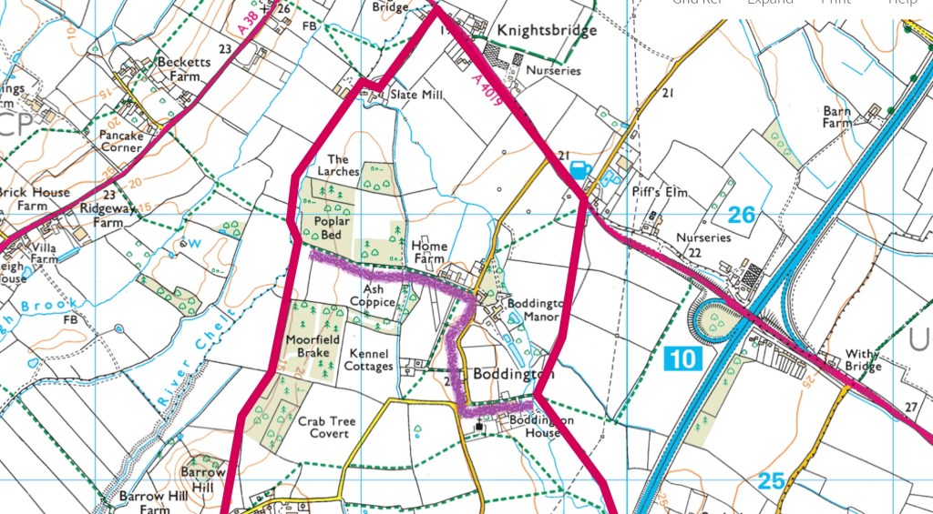 Cross the field, skirting the bottom of the small hill on your left. The hedge on the OS map is no longer there so it’s just one big field and you’re heading for the bottom right corner where there’s a stile. Walk through a small area of young trees and then along the hedge line on your right through a couple of fields. You’ll come out to a forested area ahead of you. Carry on ahead and you will be reunited with the Chelt on your left. Where a grass ‘road’ goes through the middle of the trees, there’s a footpath through a tunnel of trees. This comes out to a footbridge and then over this you cross two fields keeping the Chelt on your right. When we got to Slate Mill Farm the farmyard was blocked with lambing pens and so we backtracked and cut across to Boddington, which is shown in the images below, marked in purple as an alternative route. This route also cuts out the bit of walking along the A4019 and goes past Boddington Manor and a pretty church, so you may prefer it. I’ve since spoken to the farmer at Slate Mill Farm and he said we could walk through there if we wanted and that it would be clear after lambing season. Both routes come out on the bank of the Chelt, next to the Boddington Estate yard (like a farmyard but bigger and swankier.) Walk along the Chelt with the river on your right, towards the motorway. There’s a footbridge and then an underpass. Once under the motorway, keep the fence on your left and when you get to the farmyard cut through to the track up to the road. The other side of the road is Millhouse Farm. Here there should be two footpath options but both have unauthorised signs dissuading walkers. (I have reported both of these). The Millhouse Farm signs are permanent and more aggressive, whereas the one to the left of it is a handprinted sign which only covers the first very small field and the rest of the route from the other side is clear and well signed, so you’d be well within your rights to cross this field anyway. Alternatively you can turn left and walked up the road (not much verge here so be careful) to the A-road and then turned right and walk along (pavement on opposite side of road) until you can re-join the footpath at Uckington. I’ll update this next time I walk these paths if there’s any change. Both routes take you to the beautiful Moat house at Uckington and if I lived there I would swim in my moat every day.