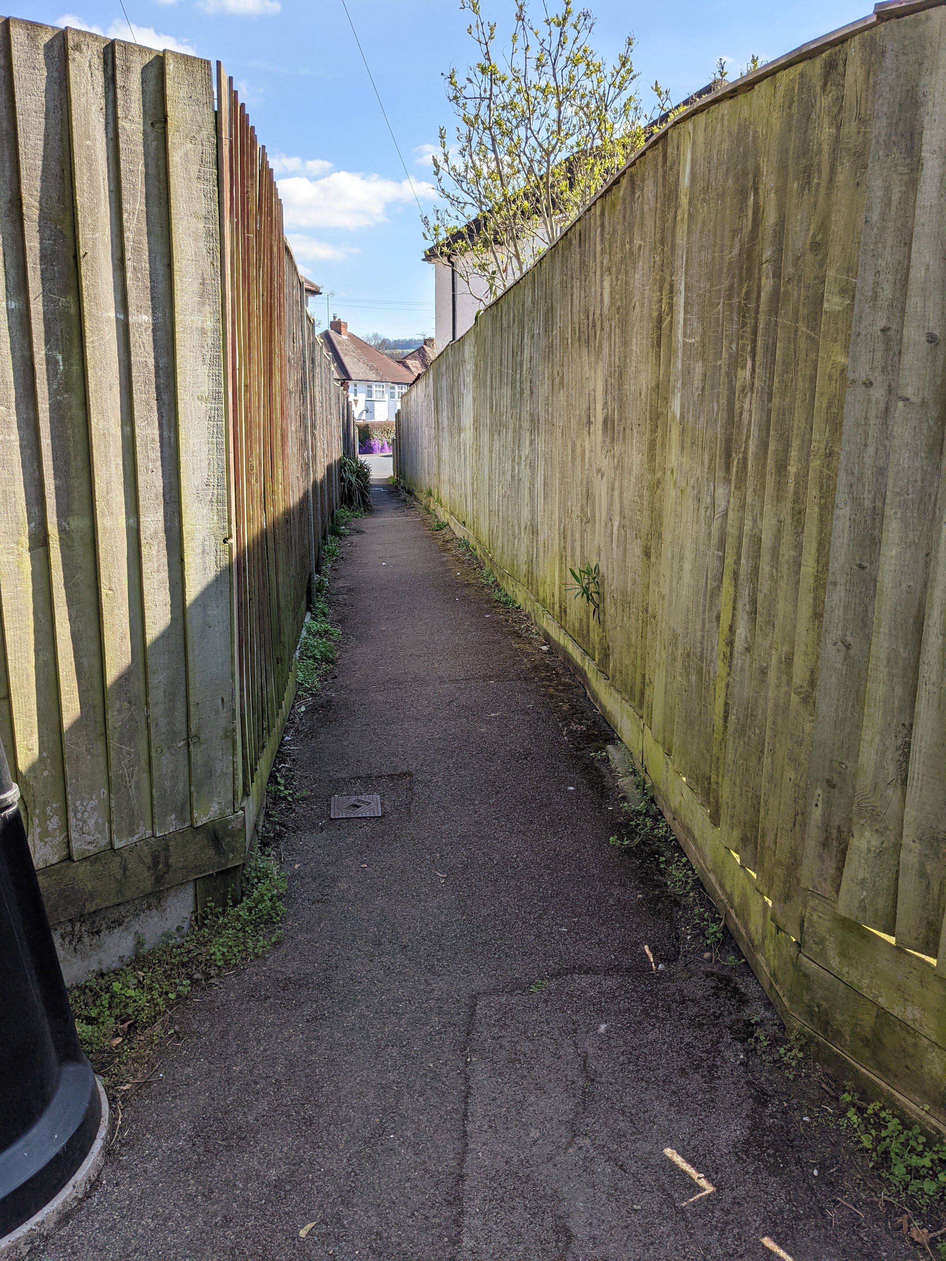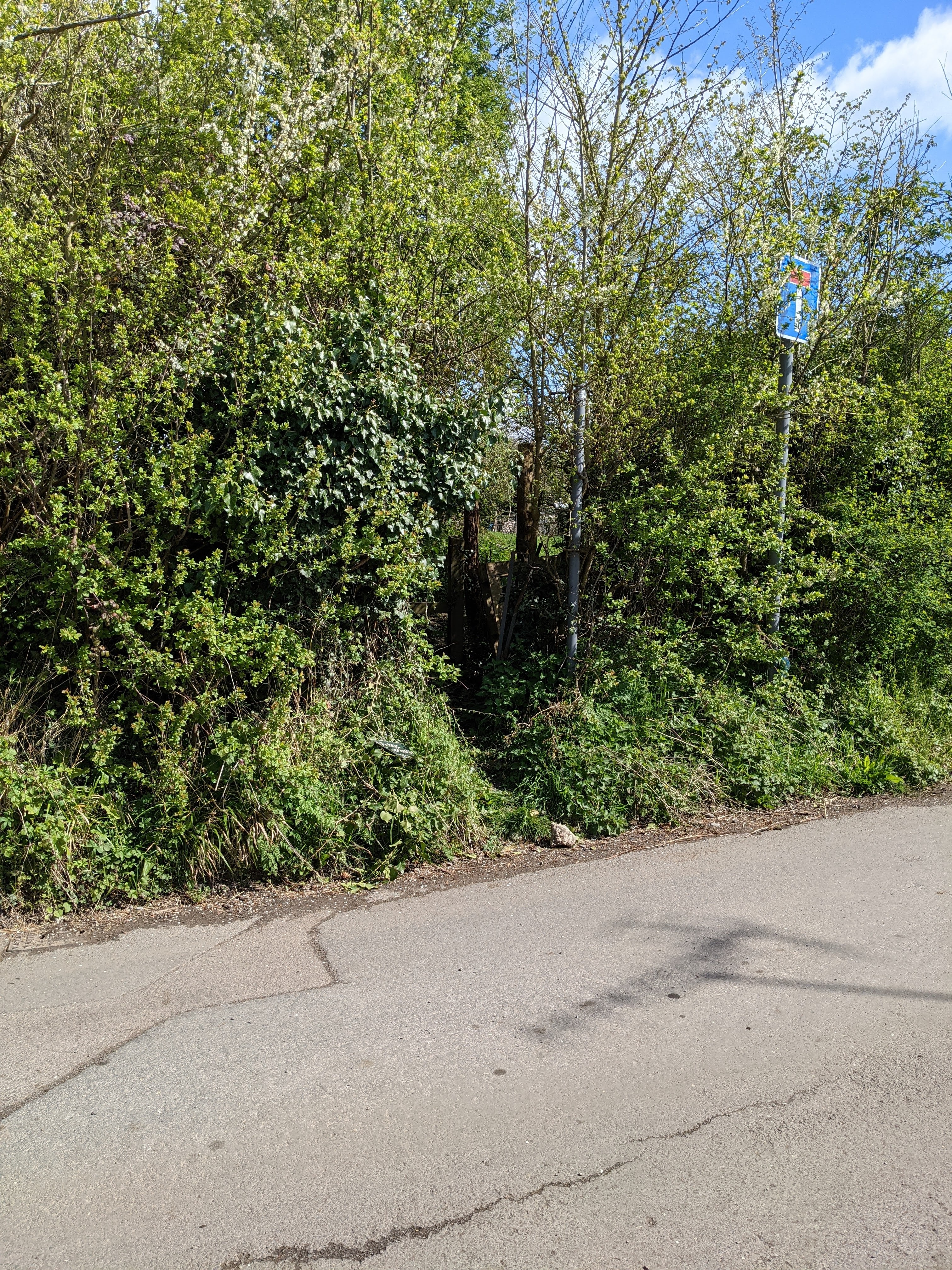 Footpath at the end of Brookway Road. The brick square hides a bit of the Chelt