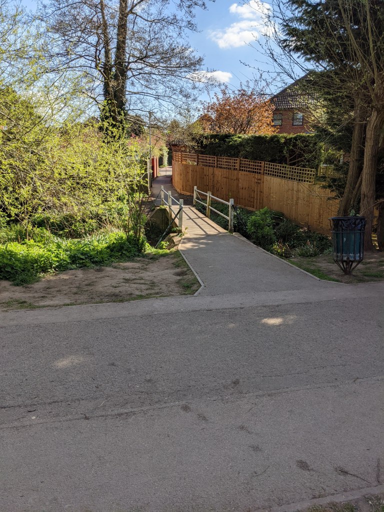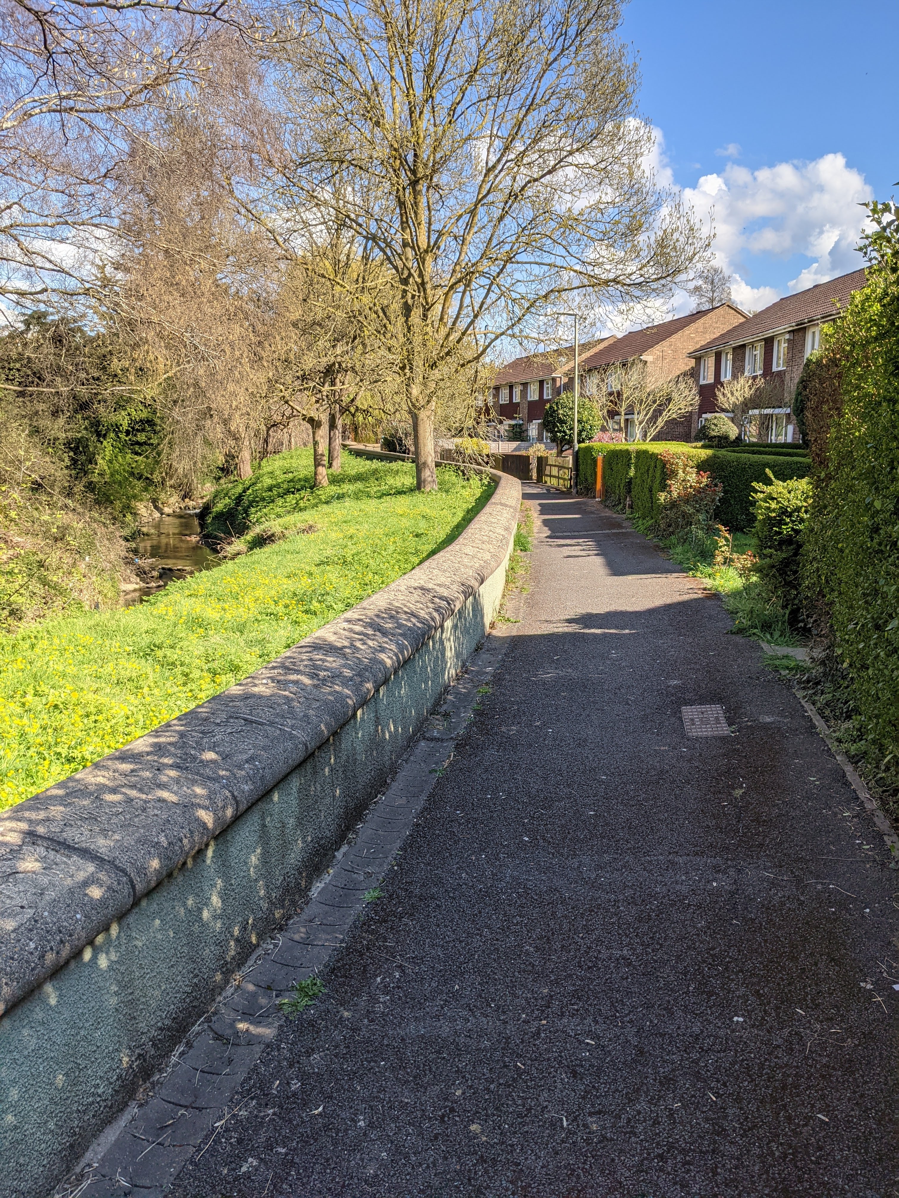 For ‘bypass’ follow footpath to Hartlebury Way and then as it turn left to go uphill cut down the right of one of the houses to the river (pictured). Follow the muddy path along the river to the left until you can squeeze through into the field and along to join the footpath.