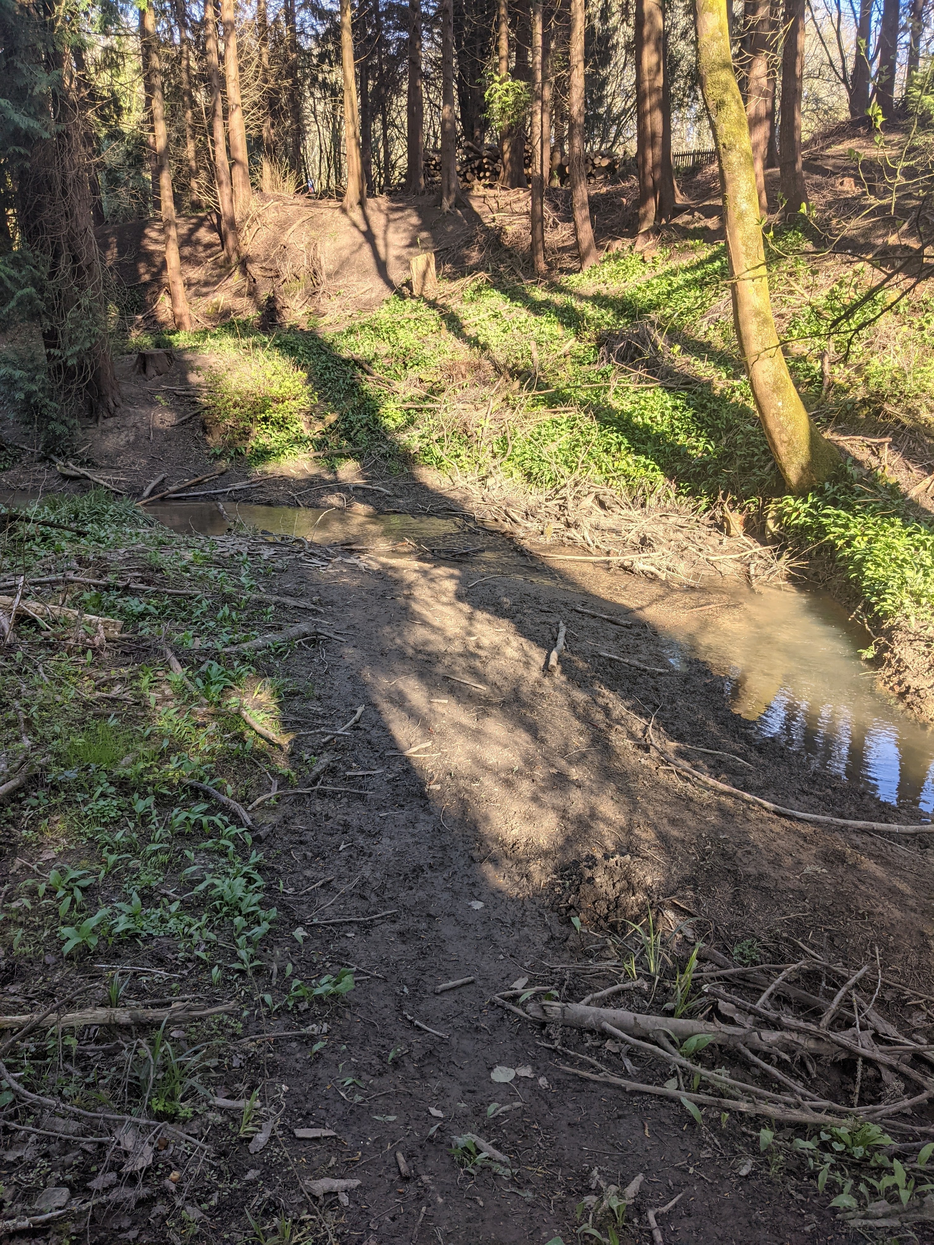 Once over the footbridge turn right and then follow the road on your left (Chancel Road) up until it meets Cirencester Road. Turn left and then right up the hill at the village green style triangle. Carry on up along Cudnall Street and then right down Brookway Road until it turns into a footpath (there’s a tiny bit of the Chelt boxed in by a brick wall). Follow the footpath up until it branches off left (signed with a green footpath sign) and into a cul-de-sac (Brookway Drive). Follow this, straight across Copt Elm Road, and continue until it turns into a footpath. Turn left and go down the hill until you get to the ford where the Chelt meets Hearne Brook. Carry on up the hill where it turns into School Road and turn right to walk along London Road. Here there’s a bit of road walking but you can do a bypass with a slightly unofficial route which gets you a bit of extra river Chelt time. I’ve marked this in the images below. Either way you end up back on the London Road until you turn left down the lane for Wellinghill House and Farm, marked with a green footpath sign. At the bottom of the lane you re-join the river and climb over the stile to your right to follow the river along. The path takes you across the river, up through a field and over several stiles. At the end of the fourth field follow the hedge down and through an archway of trees and across the field to the metal gate out to the road. There’s a short bit of road walking past Dunkerston’s Cider on your left and then come off the road down the lane towards Salts Farm caravan park. Follow the lane round to the left and then go through the wooden gate and up to the reservoir. The path leads you up and then back down again to the right to walk along the edge of the reservoir through the pine forest. At the end of the reservoir there’s a bit of muddy clambering over fallen trees and branches and then there’s a well trodden path alongside the banks of the baby River Chelt. When you reach a logging road over the river the path crosses over so you’re walking with the Chelt on your left. Keep following the path until it peters out and cross the river again, on a small wooden plank bridge. From here the path is visible but weaves either side of a fallen down mesh fence so watch your step. You’ll get to a metal gate where the Chelt disappears past a fence and barbed wire and shortly afterwards disappears under the road. There is a small stream marked on the map the other side but as it’s not officially accessible by footpath and some people disagree as to which spring marks the beginning of the Chelt, I’ve chosen to end the trail here at the gate. You can climb over and out onto the road but it would be safer to walk back through the woods, past the reservoir.